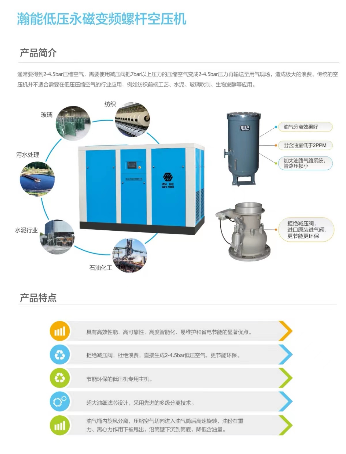 產(chǎn)品可靠、節(jié)能、靜音。已為國內(nèi)多家大型企業(yè)、上市企業(yè)解決全方位空氣集成系統(tǒng),并大量集中出口韓國、印度尼西亞、泰國等國家,并受到客戶好評(píng)。